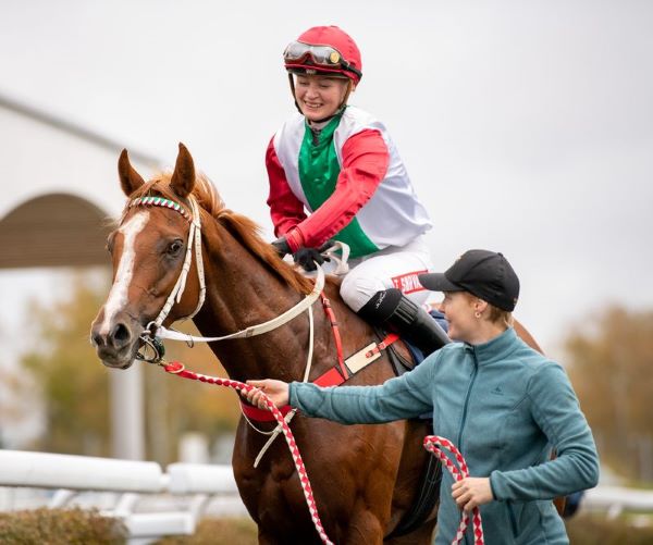 TRE I STØTET: Appel Ride, Tonje Sørvang og Anna Pilroth. Foto: Elina Westrin/Svensk Galopp