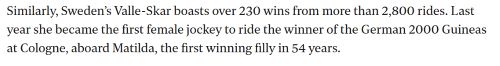 * Frida Valle Skar fyller 28 år den 5. februar. Hun vant 46 løp i Frankrike i fjor og står nå bokført med 240 førsteplasser. Tre av dem tatt på Øvrevoll i 2016 (Borzakovski, Ingvild, Tookwino). Hun var seirende rytter i 2000 Guineas (Gruppe 2) i Tyskland i fjor på hoppa Matilda som vant det klassiske løpet med 6,5 lengder. I november i fjor fikk hun pene overskrifter etter fire seire (én delt) på Saint-Cloud i Paris på én løpsdag (faksimilen fra Paris Turf på X over).