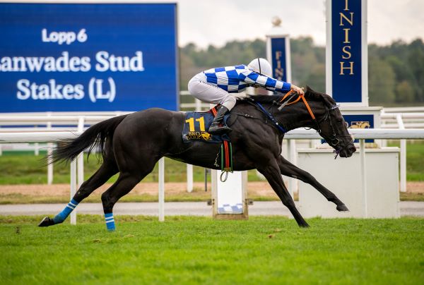 FIRE SEIRE: Capitana Bling (nå 4 år), her i en stilstudie med fast makker Manuel Martinez, har vunnet 4 av 14 starter: To av disse er dirtløp. Hun var først i mål i Norsk 1000 Guineas og også i Listed-løpet Lanwades Stud Stakes (bildet over) på Bro Park. Foto: Svensk Galopp