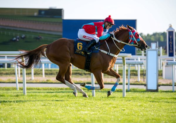 VINNERDUO: Her vinner Tonje Sørvang med Sverige-spesialisten Norlando. Foto: Elina Westrin/Svensk Galopp