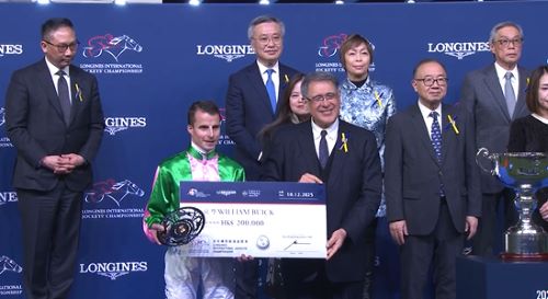 * William Buick (skjermdump fra The Hong Kong Jockey Club under) delte sølvet med Australias Hugh Bowman på Happy Valley, en bane som har "tight turns and fast rythm" og som ofte favoriserer hjemmejockeyene - men ikke denne gang.