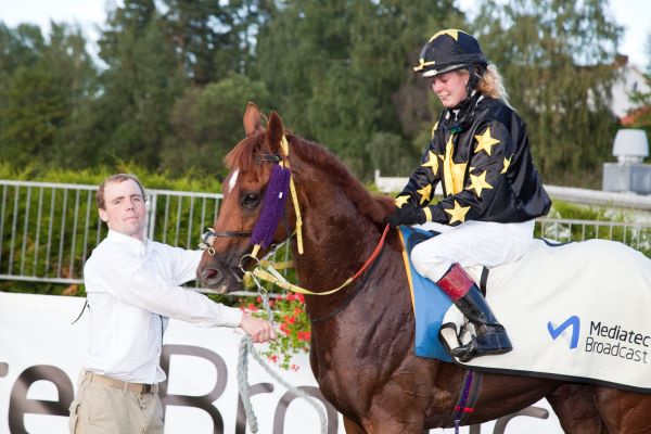 * Nathalie Mortensen har 71 jockeyseire på Øvrevoll. Den første tok hun med Jim Beam (Roger Svalsrød og Hesteguidens bilde, trener Henrik "Henke" Engblom til venstre) den 6. august 2009 i et amatørløp der Silja Støren var toer med Dark Pride.