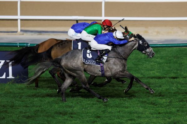 * Dubai Beach (bildet over nærmest, Foto: ERA/Race Photo) vant Cape Verdi (Gr.2) den 16. januar på tiden 1.35,67 på 1600 meter gress. En sterk tid; Gruppe 1-hesten Master Of The Seas fra Godolphin og William Buick har banerekorden på distansen med 1.34,28. Dubai Beach var 6,37 lengder foran Capitana Bling i Cape Verdi.