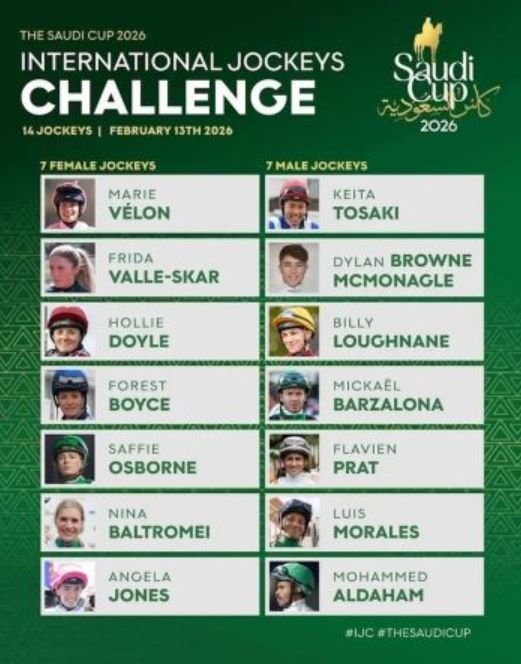 Keita Tosaki er en japansk stjernejockey (toer etter Christophe Lemaire i 2025), og irske Billy Loughnane satte britisk rekord (etter år 2000) med 222 vinnere i fjor. Hollie Doyle og Frankrikes kjendisrytter Marie Velon er jentetoppene i de fire løpene i Riyad fredag ettermiddag.
