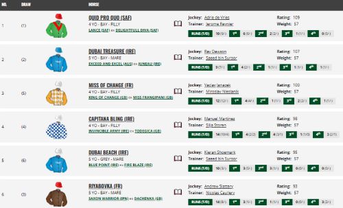 * Førstepremien ruver; 510.000 AED, nesten 1,4 millioner norske kroner. Seks hester starter, Capitana Bling (Stall Flax eier, Manuel Martinez rir) er fjerderangert og har fått startspor 4 på 1600 meter gress. Starttidspunkt for løp 7 på Meydan: Kl. 18.00 norsk tid. Easywithme fra Niels Petersen ble nummer tre i dette løpet i fjor.